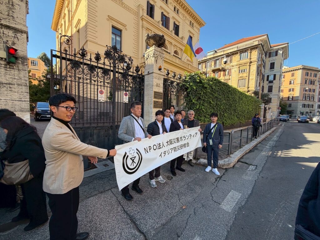 研修初日は、在イタリア日本大使館を訪問し、イタリアにおける防災の在り方や、行政とNPO団体がどのように連携しているのかについて詳しくお話を伺いました。また、当法人が今後進むべき方向性についても、貴重なアドバイスをいただくことができ、大変有意義な時間となりました。
